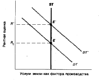Предложение земли в экономике фиксировано, как это наглядно показывает кривая ST. Кривая спроса на услуги земли DT получена при помощи кривых, отображающих предельную ценность земли для отдельных компаний. Если цены на сельскохозяйственную продукцию растут, предельная доходность земли увеличивается для всех компаний. Это показано в виде сдвига кривой спроса с DT до DT’. Это приводит к росту ставки арендной платы на землю с R0