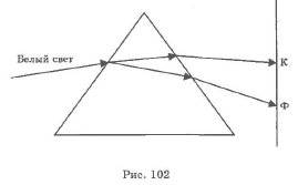 Как уже говорилось, свет, проходя через трехгранную призму, преломляется и при выходе из призмы отклоняется от своего первоначального направления к основанию призмы. Величина отклонения луча зависит от показателя преломления вещества призмы, и, как показывают опыты, показатель преломления зависит от частоты света. Зависимость показателя преломления вещества от частоты (длины волн) света называется дисперсией.О чень просто наблюдать явление дисперсии при пропускании белого света через призму (рис. 102). При выходе из призмы белый свет разлагается на семь цветов: красный, оранжевый, желтый, зеленый, голубой, синий, фиолетовый. Меньше всех отклоняется красный свет, больше - фиолетовый. Это говорит о том, что стекло имеет для фиолетового света наибольший показатель преломления, а для красного - наименьший. Свет с разными длинами волн распространяется в среде с разными скоростями: фиолетовый с наименьшей, красный - наибольшей, так как n= c/v ,