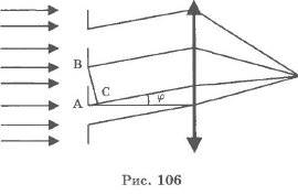 На рис. 105 изображена плоская световая волна, падающая на непрозрачный экран с отверстием. За экраном фронт результирующей волны (огибающая всех вторичных волн) искривляется, в результате чего свет отклоняется от первоначального направления и попадает в область геометрической тени.