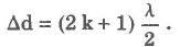 Если дельта d равна нечетному числу длин полуволн, то при сложении волн гребень одной волны будет накладываться на впадину другой, поэтому волны будут максимально ослаблять друг друга