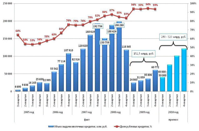 Банки РФ в 2010 году, по прогнозу, выдадут около 340 миллиардов рублей ипотечных кредитов, сообщил гендиректор Агентства по ипотечному жилищному кредитованию (АИЖК) Александр Семеняка в четверг журналистам в рамках финансового форума. Таким образом, объем выдачи ипотечных кредитов вырастет в 2,2 раза по сравнению с 2009 годом, когда этот показатель составил 152,5 миллиарда рублей.