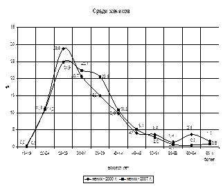 Несмотря на наличие в данных текущей статистики сведений о распределении вступивших в брак по возрасту, представляется нецелесообразным рассчитывать ежегодно возрастные коэффициенты брачности. Их использование в анализе может не прояснить, а, наоборот, затушевать тенденции изменения брачности. Во-первых, как и в отношении общего коэффициента брачности, в данном случае мы можем рассчитать возрастные показатели только для всего населения соответствующих возрастных групп, а не для тех, кто не состоит в браке (эти данные дает только перепись населения). Следовательно, они будут зависеть от доли не состоящих в браке в данном возрасте. Это, что касается характеристики интенсивности вступления в брак в том или ином возрасте, ее изменения в динамике и территориальных различий. Во-вторых, рассчитываемые таким образом возрастные коэффициенты брачности не позволят отслеживать сдвиги в возрастной модели брачности, т.е. повышении или снижении возраста вступления в брак. Дело в том, что, кроме отмеченного выше недостатка, у исходной статистической информации в нынешнем ее виде есть еще один. Распределение вступивших в брак по возрасту не дифференцируется по первым и повторным бракам. Следовательно, изменения или различия в распределении возрастных коэффициентов брачности могут быть связаны не только с реальным снижением или повышением возраста вступления в брак, но и с изменением или различием соотношения доли первых и повторных браков.