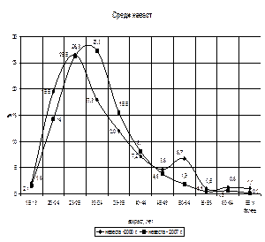 а) распределение вступивших в брак по полу и возрасту, выявляющие тенденции к постарению и омоложению браков, разницу в этих тенденциях у мужчин и женщин;