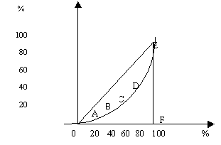 Величина ВВП на душу населения в разных странах различна. Так, в 1986 г. в США он составлял 17 840 долл., а в Эфиопии — 120 долл. (в 146 раз меньше, чем в США). Неодинаково распределяются доходы и между различными группами населения внутри стран, т. е. в рыночной экономике существует проблема неравенства доходов. Равное распределение — это когда, например, на 20% семей приходится 20% дохода, на 40% семей — 40% дохода, на 60% семей — 60% дохода и т. д. В реальной действительности существуют отклонения. Неравенство доходов можно выразить с помощью кривой Лоренца