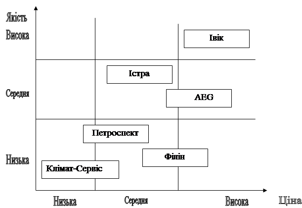 Для повнішого розуміння особливостей позиціонування ТзОВ "Істра" проведемо аналіз за допомогою карт-схем сприйняття продукції, що виробляється даним підприємством у порівняні з конкурентами (рис. 3.2). Основними конкурентами на ринку є фірми “Філін”, "АЕG", "Петроспект", "Івік", "Клімат-Сервіс" за ключові атрибути приймемо два важливі фактори – ціна та якість продукції.