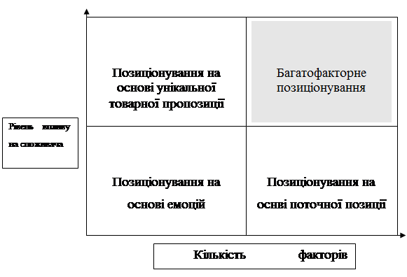 - Багатофакторне позиціонування (оптимальне співвідношення "ціна-якість"). Використовується, коли існує велика конкуренція, і фірма програє конкурентам за домінуючою ознакою.