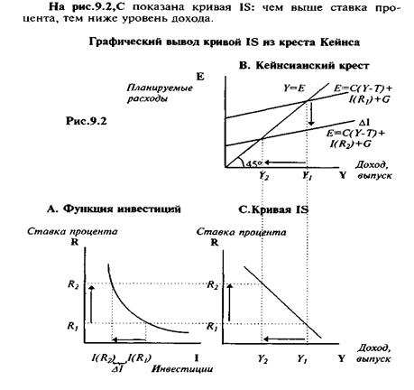 Если рынок товаров и услуг находится в неравновесии, то происходит непредвиденное изменение запасов, и фирмы либо сокращают, либо увеличивают объем производства, двигая экономику в точку Е. Если денежный рынок в неравновесии, произойдет давление на ставку процента, и она будет расти при избыточном спросе на деньги, поскольку люди начнут продавать облигации, если они не смогут удовлетворить свой спрос на деньги иным путем, или покупать облигации, если предложение денег превышает спрос на них, и экономика начнет передвигаться в точку Е.