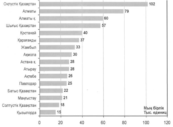 Обзор СМП, осуществляющих экономическую деятельность, в региональном разрезе за 2008 год показывает, что наибольшее количество СМП функционируют в Южно-Казахстанской области (102 тыс.), в Алматинской области (79 тыс.) и в г.Алматы (60 тыс.). Наименьшие показатели имеет Кызылординская (15 тыс.), Северо-Казахстанская (18 тыс.), Мангистауская (21 тыс.) и Западно-Казахстанская (22 тыс.) области.(Рисунок 2)