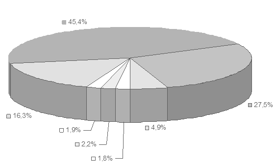 По признаку отраслевой направленности малого предпринимательства можно отметить, что с начало года в сельском хозяйстве работали 45,4% СМП, торговле – 27,5%, транспорте и связи – 4,9%, в промышленном производстве – 1,8%, гостиничном бизнесе – 2,2%, строительстве – 1,9% и остальными видами предпринимательской деятельности – 16,3%.(Рисунок 3)