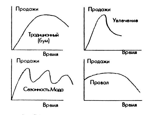 Жизненные циклы товаров различны и зависят от многих факторов: особенностей самих товаров и изменений, происходящих с потребителями, окружающей средой. Основные характерные виды ЖЦТ представлены на рис. 1.