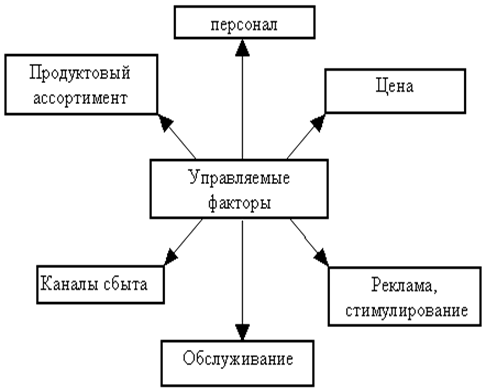 : товар (свойства товара, его дизайн, упаковка, торговая марка), цена, методы сбыта и коммуникации, продвижение (сервис, позиционирование, выбор целевого сегмента);