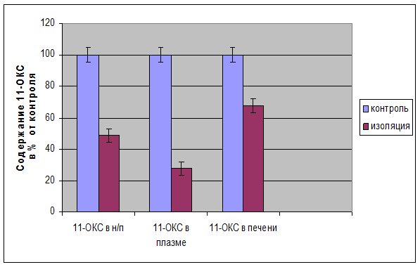 Целью нашей работы было исследование влияния долгосрочной изоляции на уровень 11-оксикортикостероидов в плазме, печени, в левом надпочечнике, а так же на уровень адреналина в правом надпочечнике у крыс.