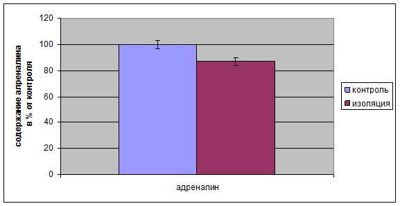 Необходимо отметить, что наряду с уменьшением содержания 11-ОКС происходило так же и уменьшение концентрации адреналина в надпочечниках у крыс, пребывавших в долгосрочной социальной изоляции (рис. 2.3). Это связано с угнетением функции симпатоадреналовой системы. Происходит истощение и нарушение данных функций [24].