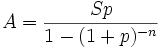 A — сумма аннуитета, S — сумма кредита, p — процентная ставка за период в долях, n — количество периодов