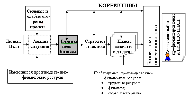 На первое место в данном случае ставится определение личных целей бизнесмена. После оценки ситуации как вне, так и внутри компании определяется главная цель. Затем можно перейти к разработке стратегии, которая представляет собой процесс конкретизации главной цели, разбивку ее на задачи и подзадачи. На каждом этапе реализации выбранной стратегии целесообразно вносить в план определенные коррективы, которые диктует реальный ход событий. Таким образом, вырабатывается оперативный план. На основе долгосрочных тенденций и оперативного плана разрабатывается долгосрочный план. Замысел плана всегда нуждается в тщательном обосновании и проверке на осуществимость. С этой целью его разворачивают в систему частных стратегий: товарно-рыночную, НИОКР, систему развития потенциала и финансовую систему, которая реализуется на втором этапе планирования. Стратегия НИОКР является ведущей. Она выявляет и формирует комплекс разработок, наиболее актуальных для потребителя и соответствующих научно-техническому потенциалу предприятия. По итогам разработки различных вариантов стратегии уточняются как ожидаемые размеры прибыли, так и потребности в капитальных вложениях. Эта информация поступает на вход финансовой стратегии, предназначенной для окончательного балансирования финансовых потребностей и определения размеров и форм привлечения заемных средств. На третьем этапе формирования стратегического плана результатные данные по каналам обратной связи поступают на вход замысла плана с целью его корректировки. Окончательный вариант плана вместе с результатами анализа внешней среды, а также возможностей фирм оформляются в виде глобальной стратегии развития. В целом можно сделать вывод, что перечисленные методики планирования весьма сходны и в основном дополняют друг друга, рассматривают бизнес-планирование с разных сторон и выделяет различные этапы планирования в качестве основных. Любой проект, даже самый крупный, обычно является лишь элементом инвестиционной программы, осуществляемой в рамках инвестиционной политики фирмы. Разработка этой политики предполагает: формулирование долгосрочных целей деятельности фирмы; поиск иных перспективных сфер приложения свободного капитала; разработку инженерно-технологических, маркетинговых и финансовых прогнозов; формулирование целей и подцелей инвестиционной деятельности; исследование рынка и идентификацию возможных и доступных проектов; экономическую оценку и перебор вариантов в условиях различных ограничений (временных, ресурсных, имеющих экономическую и социальную природу и др.); формирование инвестиционного портфеля; подготовку и периодическое уточнение бюджета капитальных вложений; перманентную оценку действующих проектов; оценку последствий реализации завершившихся проектов. Согласно рекомендациям ЮНИДО бизнес-план имеет следующую структуру: Цели проекта, его ориентация и экономическое окружение, юридическое обеспечение (налоги, государственная поддержка и т.п.); Маркетинговая информация (возможности сбыта, конкурентная среда, перспективная программа продаж и номенклатура продукции, ценовая политика); Материальные затраты (потребности, цены и условия поставки сырья, вспомогательных материалов и энергоносителей); Место размещения с учетом технологических