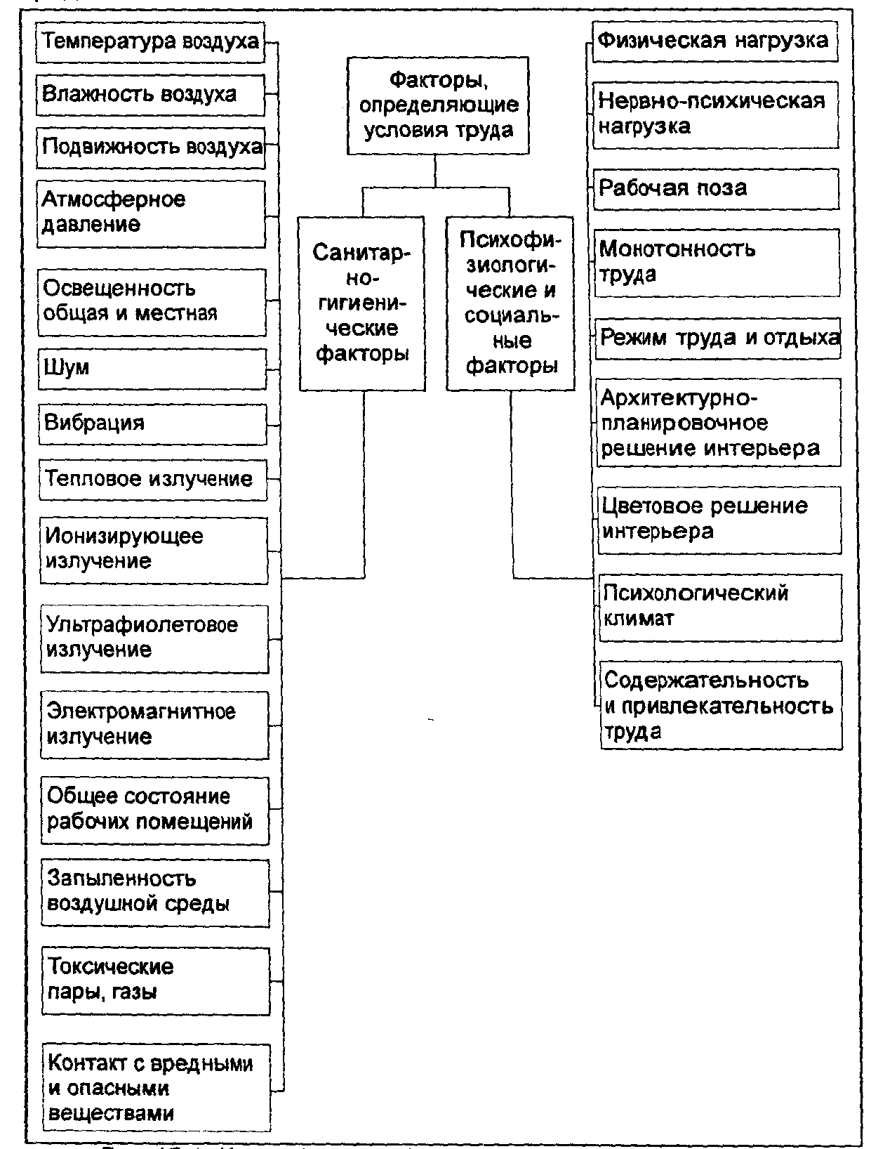 Согласно ГОСТ 12.0.003-74 опасные и вредные производственные факторы подразделяются на четыре группы: – физические; – химические; – психофизиологические; – биологические. К физическим факторам относятся: повышающий уровень напряжения в электросети, статическое электричество, неблагоприятные условия по микроклимату, по освещенности, наличие вредных веществ, особенно при тепловой обработке тканей, работающее швейное оборудование, шум, вибрации. К химическим факторам относятся: СО, СО2, пыль, хлопчато-бумажная пыль, пыль синтетических полушерстяных и шерстяных тканей. К психологическим факторам относятся: нервно – эмоциональные напряжения, физические перегрузки, неудобная рабочая поза, монотонность, напряжение рук мышц. К биологическим факторам относятся: микробы, вирусы, вносимые в помещения, особенно во время эпидемий. Основными причинами несчастных случаев можно назвать плохое содержание рабочего места, отсутствие инструктажа, недостаточное обучение персонала безопасным методам работы, нарушение трудовой дисциплины и требований безопасности труда. Изучение опасных и вредных факторов, влияющих на работу, позволяет создать оптимальные режимы труда, учитывать особенности личной гигиены и нормативные материалы по устройству и содержанию торговых предприятий. Ликвидация или ослабление вредного воздействия на организм человека ряда факторов осуществляется непрерывным совершенствованием торгового процесса, следствием которого является устранение образования пыли, шума и вибрации; устройством совершенной вентиляции и т. п. 4.3 Мероприятия по безопасности труда персонала 4.3.1 Нормализация параметров микроклимата Очень важна в туризме работа по оздоровлению условий труда и контролю за выполнением на фирме законов по охране труда, правил и норм техники безопасности. Условия труда определяются многими санитарно-гигиеническими, психофизиологическими и социальными факторами, классификация которых представлена на рисунке. Классификация факторов условий труда (таблица 16).