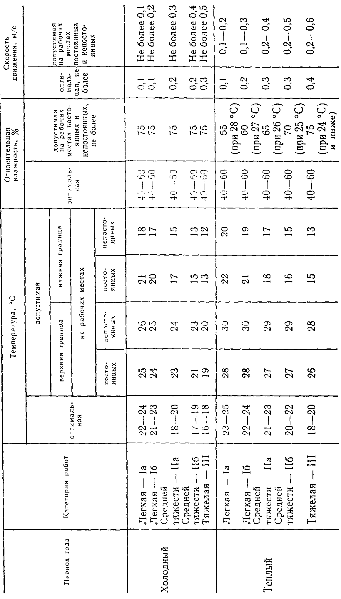 Общая количественная характеристика условий труда рассчитывается как среднегеометрическая величина частных показателей, характеризующих условия труда по отдельным факторам:  где К у.т. – коэффициент условий труда; а1, xа2 ..... – индексы соответствия фактических условий труда нормативным по данному фактору (освещенность, температура, запыленность и т.д.); n – количество факторов, характеризующих условия труда, по которым производились замеры. На функциональную деятельность человека, его работоспособность и здоровье огромное влияние оказывают метеорологические параметры. Сохранение постоянства температуры тела является необходимым условием для протекания физиологических процессов в организме, возможно лишь тогда, когда, выделяемое организмом тепло непрерывно отводится в окружающую среду, а среда способна его воспринять. В этих условиях человек не ощущает ни перегревания, ни охлаждения. Оптимальные и допустимые параметры микроклимата будут достигаться вентиляцией помещений, устройством кондиционирования воздуха. Показателями, характеризующими микроклимат, являются: 1) температура воздуха; 2) относительная влажность воздуха; 3) скорость движения воздуха; 4) интенсивность теплового излучения. Оптимальные показатели микроклимата распространяются на всю рабочую зону, допустимые показатели устанавливаются дифференцирование для постоянных и непостоянных рабочих мест. Допустимые показатели температуры, относительной влажности и скорости движения воздуха в рабочей зоне должны соответствовать значениям, указанным в таблице 17. В офисе должны соблюдаться оптимальные величины температуры воздуха 22-24 °С, его относительной влажности (60-40 % и скорости движения – не более 0,1 м/с. Оптимальные и допустимые нормы температуры, относительной влажности и скорости движения воздуха в рабочей зоне производственных помещений указаны в таблице 17.  При обеспечении допустимых показателей микроклимата температура внутренних поверхностей конструкций, ограждающих рабочую зону (стен, пола, потолка и др.), или устройств (экранов и т п.) не должна выходить за пределы допустимых величин температуры воздуха, установленных в табл. для отдельных категорий работ. Перепад температуры воздуха по высоте рабочей зоны при всех категориях работ допускается до 3 °С. Колебания температуры воздуха по горизонтали и рабочей зоне, а также в течение смены допускаются до 4 °С – при легких работах, до 5 °С – при средней тяжести работах и до 6 °С – при тяжелых работах, при этом абсолютные значения температуры воздуха, измеренной на разной высоте и в различных участках помещений в течение смены, не должны выходить за пределы допустимых величин, указанных в таблице 17. Требования к температуре внутренних поверхностей ограждающих конструкций и устройств не распространяются на температуру поверхностей систем охлаждения и отопления помещений и рабочих мест. Нормы температуры, относительной влажности и скорости движения воздуха в рабочей зоне производственных помещений указаны в таблице 17.