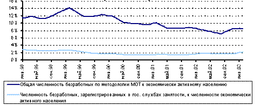 На рынке труда в России наблюдается улучшение ситуации. Общая численность безработных в отчетном периоде снизилась с 6435 тыс.чел. в январе 2003 года до 5687 тыс.чел. в марте 2004 года, т.е. на 748 тыс.чел. Темп снижения составил 11,7%.