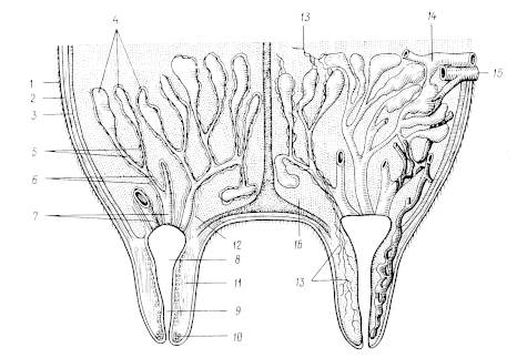 1—кожа; 2—поверхностная фасция; 3—глубокая фасция; 4—молочные альвеолы с альвеолярными протоками; 5—.выводные канальцы; 6—молочные каналы; 7—молочные ходы; 8— молочная цистерна; 9—сосковый канал; 10—сфинктер канала; 11—гладкие мышцы соска; /2—гладкие мышцы молочных ходов; 13—нервы; 14—артерия; 15—вена; 16—соединительная ткань.