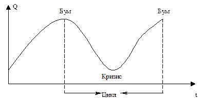 Цикл представляет собой интервал времени в развитии рыночной экономики, в течение которого происходит увеличение объема производства товаров и услуг, а затем сокращение, спад, депрессия, оживление и, наконец, снова его рост (рис. 1).