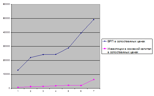 Выше коэффициент корреляции в текущих ценах уже рассчитывался r=0,55, что свидетельствует о довольно слабой связи между величиной инвестиций в основной капитали и величиной ВРП. В сопоставимых ценах, r=0,49.