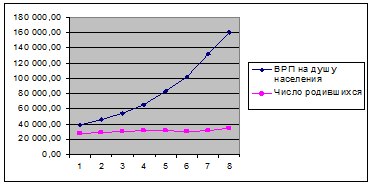 Зависимость между величиной ВРП на душу населения и числом родившихся за этот же период в регионе детей