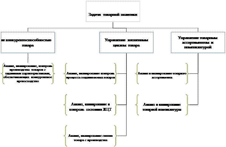 Потребители, как правило, не едины в своих предпочтениях. Стремление увеличить потребление существующего товара за счет новых областей его использования и новых сегментов рынка определяет задачу товарной политики – управление ассортиментом и номенклатурой. На рисунке 2 приводится композиция целей и задач товарной политики.