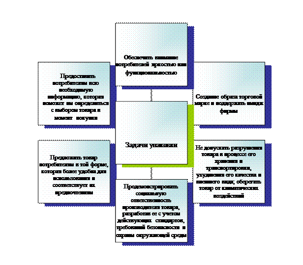 Создание имиджа товара невозможно без упаковки. Кроме того, упаковка является наиболее гибким инструментом маркетинговой деятельности, так как ее изменения н требует значительных затрат от производителя и в то же время позволяет решить ряд задач, композиция которых показана на рис.6.