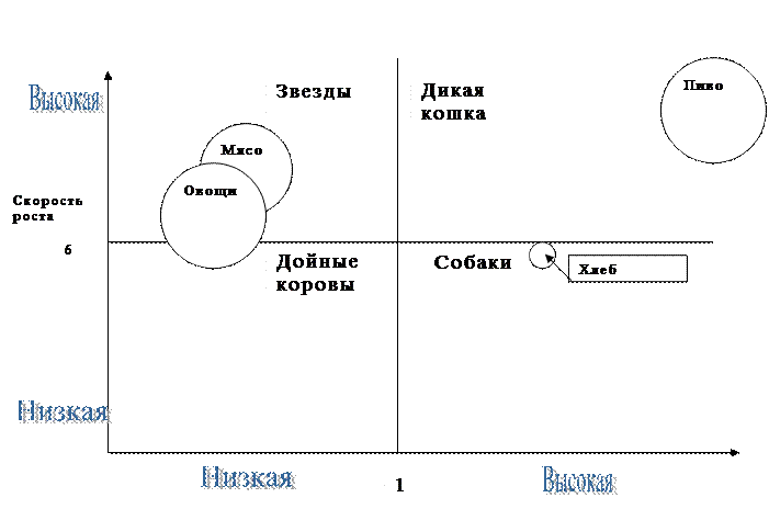 Проанализировав выше представленные данные, выявилось лидерство мясной и овощной. Они является «звездами» среди других представленных товарах. Для них характерен относительно высокий рост объёма продаж и высокая доля рынка. Товар приносит большую часть прибыли, но и требует дополнительного финансирования. А вот для большей реализации хлеба и пива организации следует приложить маркетинговые усилия.