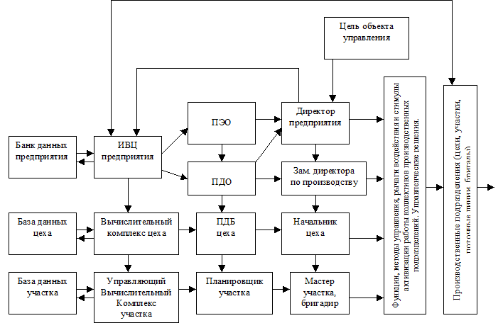 Наука и практика определили такие пути совершенствования производственной структуры как укрупнение предприятий и цехов, интеграция отдельных предприятий, создание мощных промышленных и научно-производственных объединений на основе концентрации производства, достижение конструкторско-технологической однородности продукции за счет широкой унификации и стандартизации. При этом решаются задачи совершенствования общей структуры предприятия и его производственной структуры. Эффективность совершенствования общей структуры проявляется через повышение качества управления предприятием. Известно, что объем информации, подлежащей обработке в процессе управления, находится в квадратичной зависимости от числа элементов системы. Поэтому, формируя общую структуру предприятия, важно не только определить число подразделений, основных и вспомогательных цехов предприятия, но и учесть рациональные схемы информационных связей.