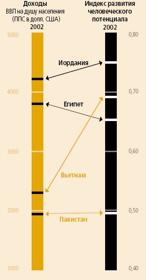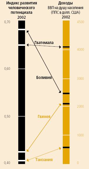 Таким образом, величина ИРЧП служит критерием разделения стран на группы с различным уровнем человеческого развития. Вне зависимости от уровня экономического развития (будь это индустриальные или развивающиеся страны) к странам с высоким уровнем человеческого развития относятся те, в которых ИРЧП > 0,8; к странам со средним уровнем человеческого развития - те, в которых 0,5 < ИРЧП < 0,8; к странам с низким уровнем человеческого развития - те, в которых ИРЧП < 0,5. Помимо ранжирования и разделения стран на группы, вычисление ИРЧП и индексов отдельных измерений позволяет оценить соответствие сложившейся ситуации неким ориентирам, выраженным оптимальными значениями показателей человеческого развития, и ее изменение с течением времени. Сравнение индексов долголетия, образованности и уровня жизни дает возможность, при прочих равных условиях, уточнить приоритетность соответствующих программ человеческого развития. Индексы измерений человеческого развития могут быть использованы для определения желательных масштабов финансирования программ человеческого развития на национальном и региональном уровнях.