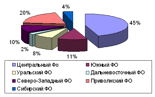 По данным Минпромэнерго, в мебельной промышленности России действует 5770 предприятий, в том числе 521 крупных и средних, на которых работает более 150 тыс. человек. Крупные и средние предприятия выпускают основной (80%) объем продукции. Основное производство мебели сосредоточено в Центральном ФО - 44,7%, в том числе в Москве и Московской области - 29,3% от общего объема выпуска. Значительная часть мебели производится также в Приволжском (20%) и Южном (10,9%) федеральных округах. Суммарная доля этих трех округов составляет 75,6% общероссийского выпуска. (см прил, диаграмма1)