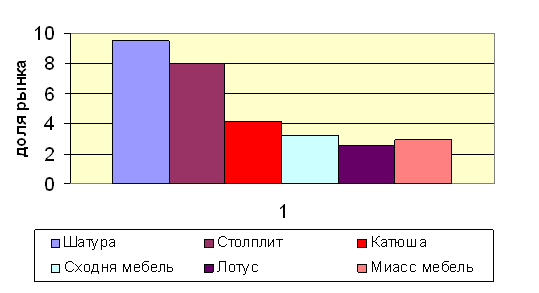 В дорогом сегменте корпусной мебели в основном действуют компании из Италии, Испании и Германии, в среднем и массовом - производители из Польши, стран СНГ и российские компании. При этом последние активно наращивают свое присутствие: сегодня им принадлежит уже более половины рынка мебели. Самые крупные - "Шатура", "Сходня-мебель", "Миасс-мебель", "Электрогорск-мебель", "Столплит", "Катюша", "Мебель Черноземья", "Ангстрем", "Севзапмебель", "Лотус", "Лазурит", их доля в данном сегменте около 70%. (см. прил., диаграмма2)