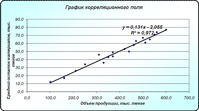 Коэффициент уравнения регрессии b = 0,1313 показывает, что при изменении объема продукции на 1 тыс. тенге средний остаток материалов изменяется в среднем на 0,1313 тыс. тенге.