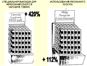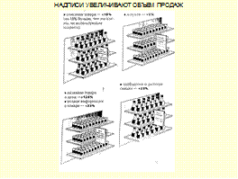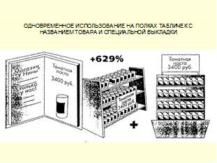 * выкладка-напоминание – создается образ товара, преобладают фотографии, картинки, рекламные призывы; могут использоваться световые и звуковые эффекты.
