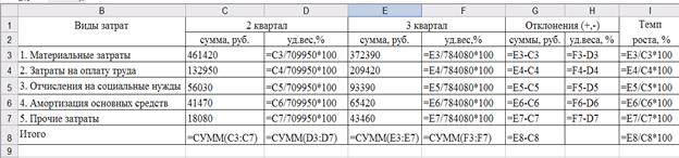Рассмотрим анализ структуры затрат ИП Мамедов (оптовая плодоовощная база), её изменение в отчетном периоде по сравнению с базисным. Рассчитаем относительные показатели структуры, абсолютный прирост и относительный темп роста.