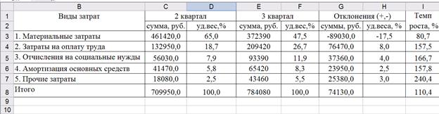 В отчетном периоде по сравнению с прошлым периодом затраты предприятия возросли на 74130 руб., или на 10,4%. В составе всех элементов затрат произошли некоторые изменения. Так, в отчетном периоде на 19,3% по сравнению с прошлым периодом снизились материальные затраты, а их доля сократилась на 17,5 процентного пункта. Остальные элементы затрат организации в отчетном периоде увеличились. Сумма затрат на оплату труда выросла на 76470 руб., или на 57,5%, а их доля увеличилась по сравнению с прошлым годом на 7,98 процентного пункта. Отчисления на социальные нужды и амортизация основных средств также возросли – на 66,7 и 57,8% соответственно. Значительный темп роста прочих затрат у организации (в 2 раза).