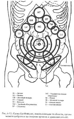 Шерон 50 лет, застой с правой стороны брюшной полости у нее особенно обширный и глубокий. Он влияет на пояснич-ную мышцу, тазобедренный сустав, связки и периферические мышцы. Нарушения в левом колене скорее всего вызваны компенсаторным напряжением. Ци Нэйцзан и массаж нижней части брюшной полости способствовали снятию напряжения в тазобедренном суставе, который стал двигаться свободней. Нижняя часть спины стала менее напряженной и болезненной.