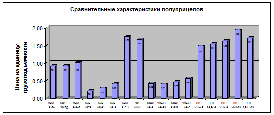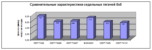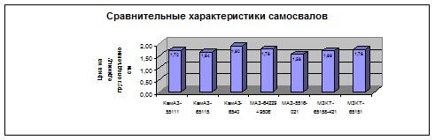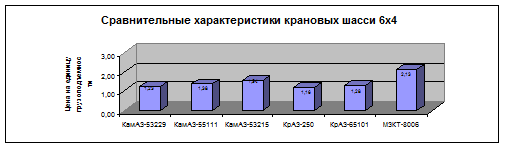 Диаграмма 1 - Сравнительные характеристики автотехники МЗКТ и аналогов по различным видам транспортных средств в долларах на 1 кг. грузоподъемности