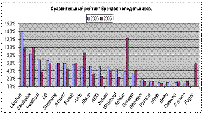 По данным www.ABC.ru составлены сравнительные рейтинги популярности брендов холодильников на период 2005-2006 год:
