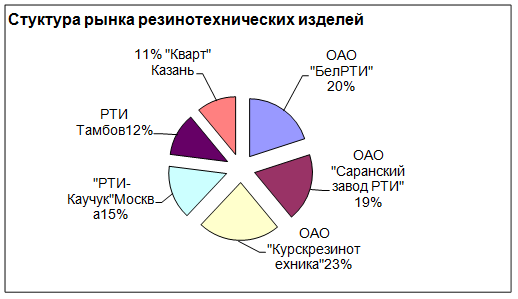 5. ОАО «Беларусьрезинотехника» на внутреннем рынке не имеет серьезной конкуренции. В основном жёсткую конкуренцию предприятие несёт по ценовому фактору, так, как цены конкурентов несколько ниже наших. Из проведённого нами анализа по некоторым видам выпускаемой продукции на предприятии можно сделать вывод о том, что продукция является конкурентоспособной за исключением манжеты. Наши сильные стороны: большая доля рынка, сложная конфигурация продукции. Слабые стороны дорогие ресурсы, продвижение; отсутствие поддерживающих кредитов. Большую роль играет имидж предприятия ОАО «Беларусьрезинотехника»: постоянно участвует в выставках, ярмарках, есть свой сайт в Интернете, проводятся мероприятия по ФОСТИС.