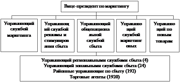 Функциональная организация. Самой распространенной схемой является функциональная организация службы маркетинга. В этом случае специалисты по маркетингу руководят разными видами (функциями) маркетинговой деятельности. Они подчиняются вице-президенту по маркетингу, который координирует их работу. В схеме на рис. 1 представлены пять таких специалистов: управляющий службой маркетинга, управляющий службой рекламы и стимулирования сбыта, управляющий службой сбыта, управляющий службой маркетинговых исследований и управляющий по новым товарам. Кроме них, могут быть еще управляющий службой сервиса для клиентов, управляющий службой планирования маркетинга и управляющий службой товародвижения.