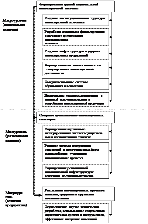 Инновационная политика исходит из интенсивного освоения нововведений и радикальных новшеств. Инновационная модель развития отрасли базируется на стратегической инновационной политике. Она призвана обеспечить приоритет нововведениям, позволяющим кардинально изменить инвестиционную активность предприятий в сторону ее роста, ускорить научно-технический прогресс и сократить разрыв в уровне экономического и социального развития между регионами и на этой основе повысить конкурентоспособность национальных предприятий и качество товаров и услуг.