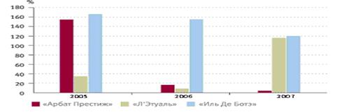 Сначала ILE DE BEAUTE появилась преимущественно в регионах. В 2001 году открылось четыре магазина, один из них – в Москве. В начале 2005 года в сети насчитывалось 17 небольших (150–300 кв. м) магазинов, причем только три из них – в Москве. Теперь компания собирается открывать по двадцать магазинов ежегодно, в том числе и в столице. Сейчас сеть насчитывает 53 магазина, 40 из них – в регионах, 13 в Москве. В сети представлены все крупнейшие брэнды (260 марок), также продукция компании Seldico (Christian Dior, Givenchy, Guerlain иKenzo). В 2007 году ILE DE BEAUTE продемонстрировала такую же высокую динамику, как и «ЛЭтуаль»