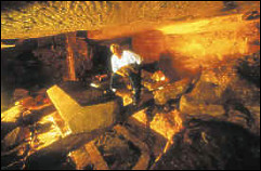 Третий уровень, лежащий на глубине 25 метров, был полностью заполнен водой. Работая в нем, мы столкнулись с самыми настоящими археологическими приключениями. Конечно, удалить воду с глубины 25 метров было совсем не легкой задачей; кроме того, мы опасались, что шахта, лишенная воды, может просто рухнуть. В итоге мы решили провести предварительную разведку. Для этого, несколько молодых людей, работающих с нами, обвязывались веревками и погружались под воду, чтобы выяснить, что же там находится, есть ли там какие-нибудь памятники. В глубине вод были видны остатки четырех столбов с огромным саркофагом между ними. Иероглифический знак «дом» был найден к востоку от саркофага.