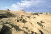 Здесь в древности располагался лагерь строителей пирамид. Он разделялся на две деревни. В одной жили постоянные рабочие, отдавшие жизни на служение царю и похороненные в Верхнем кладбище; в другой - те, кто занимался перетаскиванием камней и был погребены на нижнем кладбище. Это свидетельствует о социальной стратификации в среде рабочих, общее число которых не превышало 20 000 человек. Отнюдь не 100 000 строителей пирамид, описанных Геродотом, великим греческим историком, посетившим Египет в 5 в. до н. э. Увы, даже «отец истории» не знал всей правды о пирамидах Гизы.