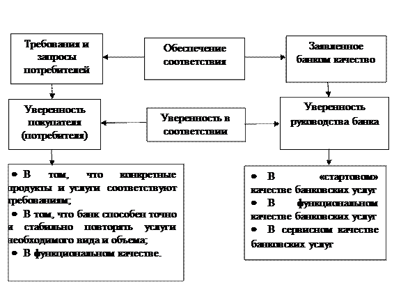 Качество менеджмента измеряется способностью персонала своевременно принимать рациональные решения, организовывать их выполнение в установленные сроки, а также достигнутыми результатами (экономическим эффектом). Качество банковских услуг в соответствии с требованиями концепции TQM и международных стандартов качества ИСО 9000-2000 и ИСО 14000 – степень соответствия совокупности собственных характеристик банковских услуг предъявляемым к ним требованиям.