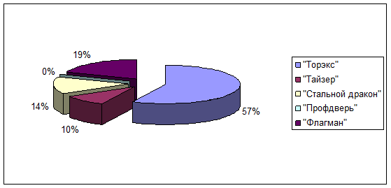 Вывод: В результате анализа сведений, получения путем проведения опроса, получены следующие данные: большинство (57 %) отдают фирме «Торэкс», 19% «Флагман», 14 % «Тайзер», 10 % «Стальной дракон» и 0 % «Профдверь».