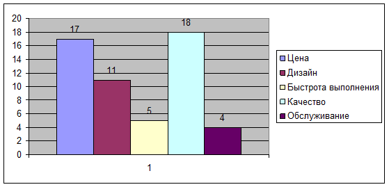Вывод: Анализ показал, что для большинства важно цена и качество, потом идет дизайн, малую важность имеет быстрота выполнения и обслуживание.