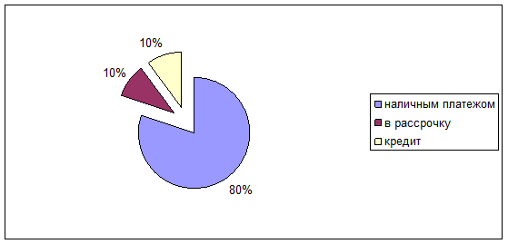 Вывод: Анализ опроса показал, что наиболее распространена форма оплаты в виде наличных сумм (80 %), остальные предпочитают приобретать двери в рассрочку и кредит по (10 %).
